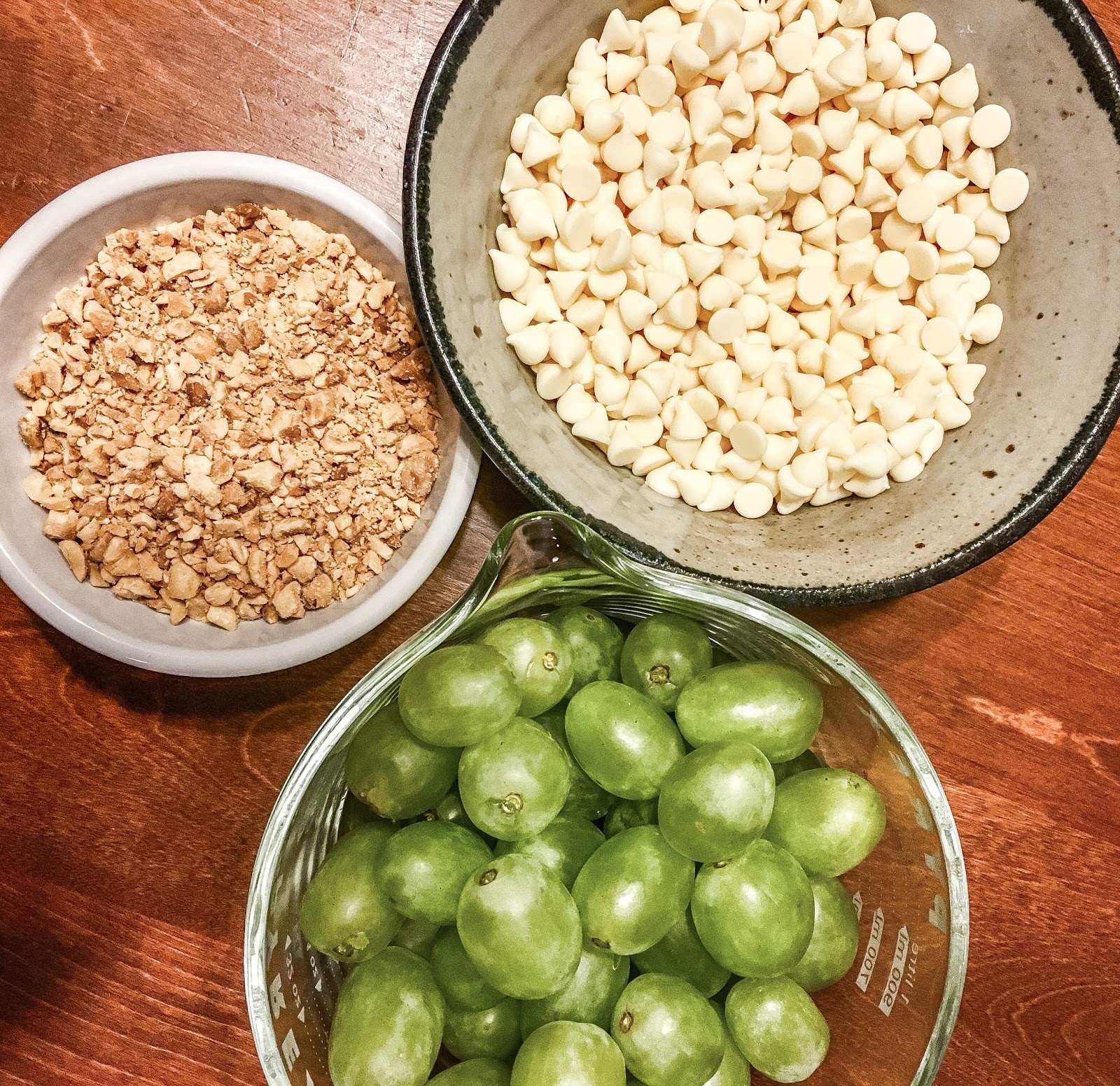 To make these amazing treats, start by washing grapes and drying thoroughly with paper towels. Crush peanuts if needed. I put them in a plastic bag and use the back of an ice cream scoop to crush them; sometimes you have to be resourceful on the island! You can also buy peanuts already crushed or use a rolling pin.