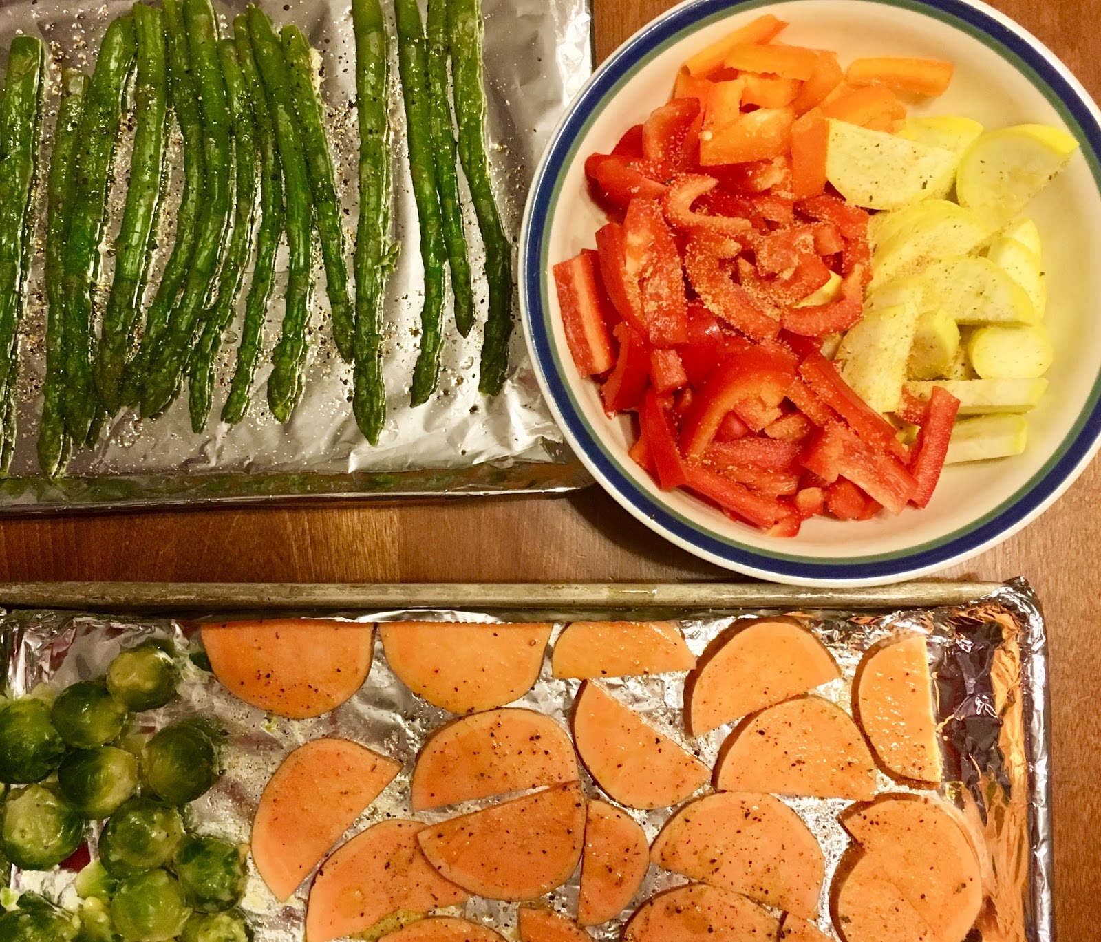 To roast vegetables, set your oven to at least 450 degrees and slice up a variety of vegetables. Tonight we are using sweet potato, orange pepper, red pepper, brussel sprouts, and squash. I like to start with fresh vegetables most of the time, because I find they stay crunchy better than frozen. Although, I do use frozen vegetables sometimes depending what is available on island. Today, we are using