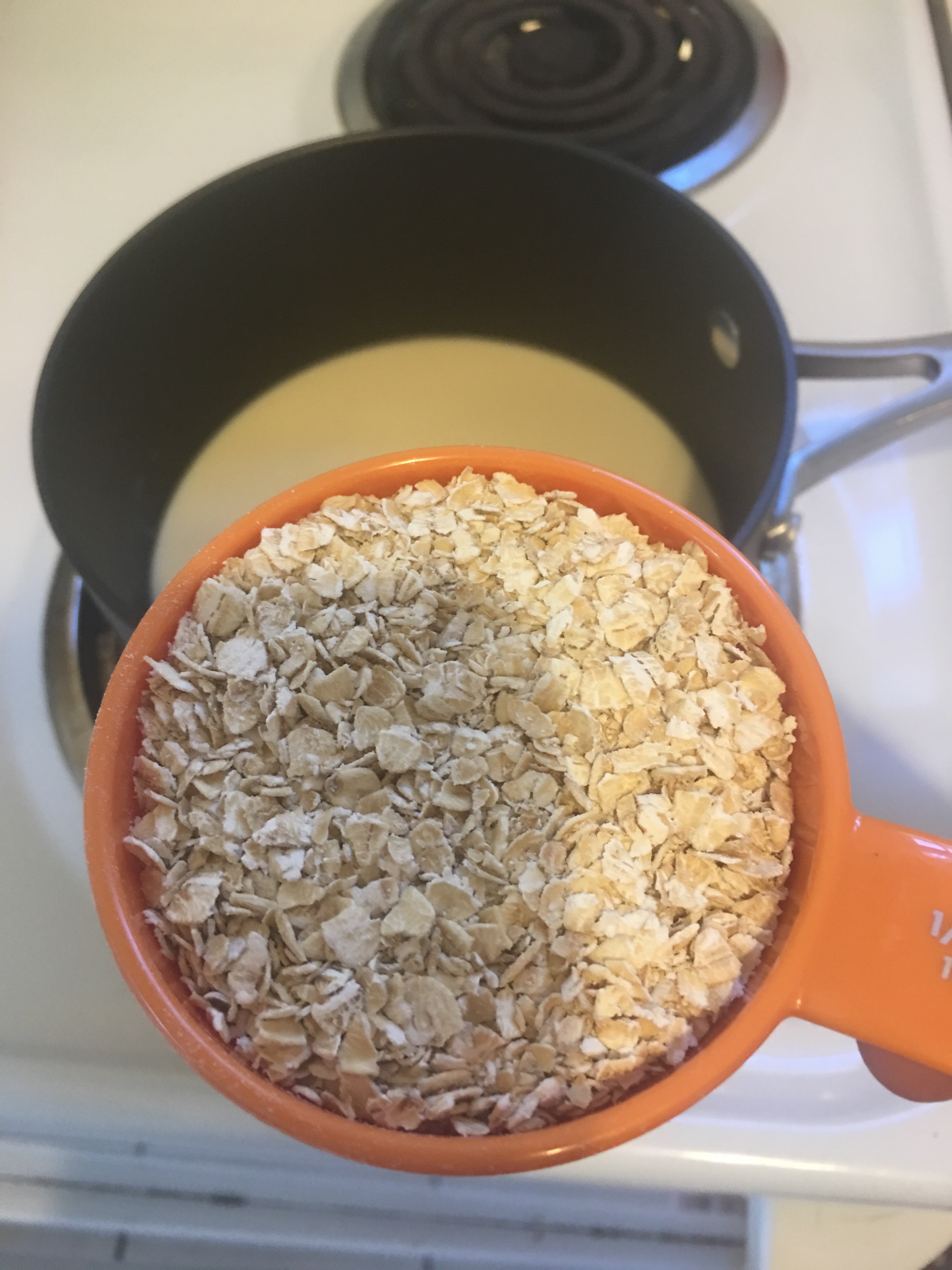 Bring milk to boil on stove top. Add oatmeal. Boil for one minute. Cover, reduce heat, add remaining ingredients and simmer till desired consistency!